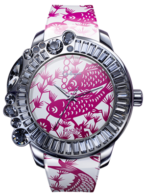 【Graceful -華藝卓約】栩栩如生的鯉魚剪紙腕錶系列,將歷史悠久的中國剪紙藝術融入腕錶設計,錶面以鏤空剪紙手藝,繪出寓意吉祥的鯉魚,更用上代表中國花牡丹的紫紅色拼上白色錶帶,以奪目之色及傳統紙藝,激撞出時尚感覺!