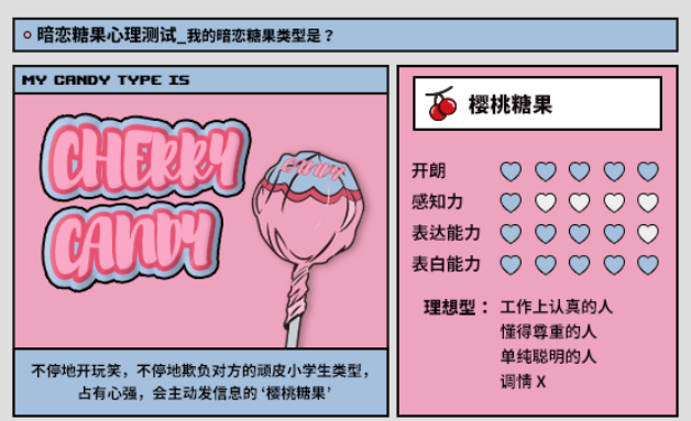 這個測驗的結果真的超可愛!會告訴你的口味之外,也會認真分析你的各種技能,開朗指數、感知力、表達能力、表白能力、重點是居然把理想型列出來給你!