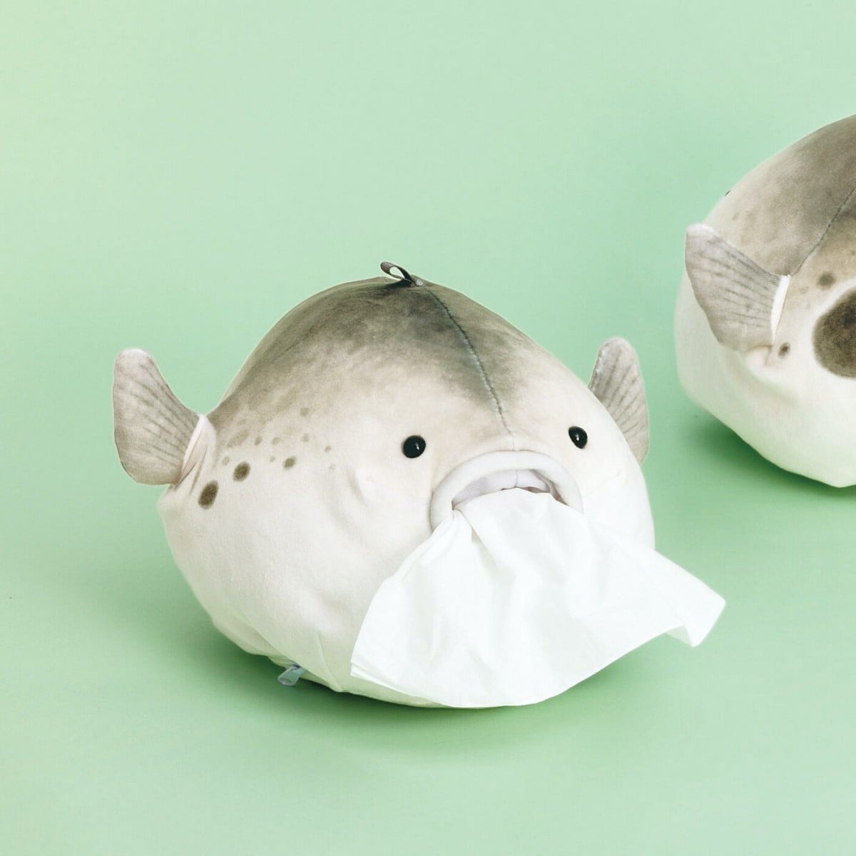 日本 FELISSIMO 設計的「河豚造型面紙盒套」,將圓滾滾的河豚化身面紙套。在抽取面紙時除了可以增加互動感之外,還能瞬間釋放緊繃情緒,完美勝任解壓神器。