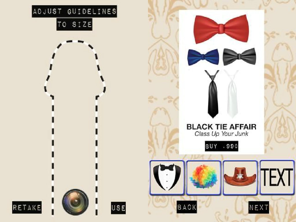 這個App實在有夠詭異的,是讓各位男士們裝飾他們的小弟弟。將小弟弟對好介面上的線後拍下,就可以替它穿新衣、戴新帽,或戴鬍子、領帶等等,這簡直就是男性成人版洋娃娃遊戲吧!目前iTunes跟Google play皆已經將《dickorate》下架。