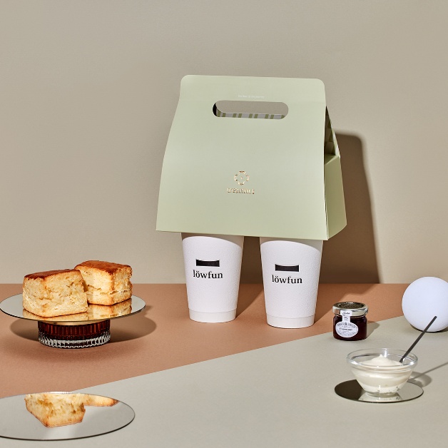 『分享』是品牌頌揚的悅人生活哲學,司康套組設定為與好友、家人輕鬆簡單就能享用的情境,選購任兩杯茶飲,即可以190元價格加購,內含2顆原味司康、1個凝結奶油。司康套組單手可提便利設計,提盒內裏也別具巧思,開盒似野餐巾鋪墊,更添生活儀式感,消費者可另選購英國Tiptree莓果果醬品嚐司康不同的風味;此組合每日限量販售,於löwfun勤美誠品店首賣,公益店、誠品南西店也將陸續上市。