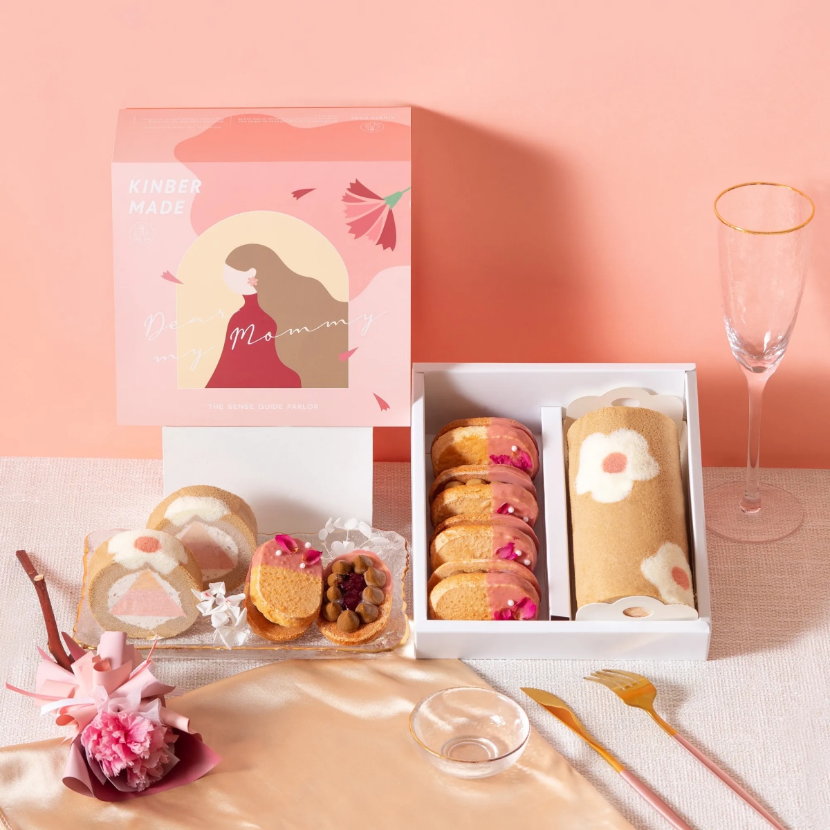 台中知名甜點店「KINBER MADE 金帛手製」,今年也推出超浪漫母親節蛋糕及甜點組合「花樣年華」,內容包含了以伯爵茶蛋糕搭配玫瑰花瓣醬和玫瑰巧克力的「古典玫瑰伯爵奶茶雪糕捲」、「覆盆莓伯爵達克瓦茲」以及母親節封套、小卡等。另外還有一款結合了藍莓、香蕉的清爽優格款生乳捲「布露貝莉的早晨」,和藍莓重乳酪蛋糕「綻放」。