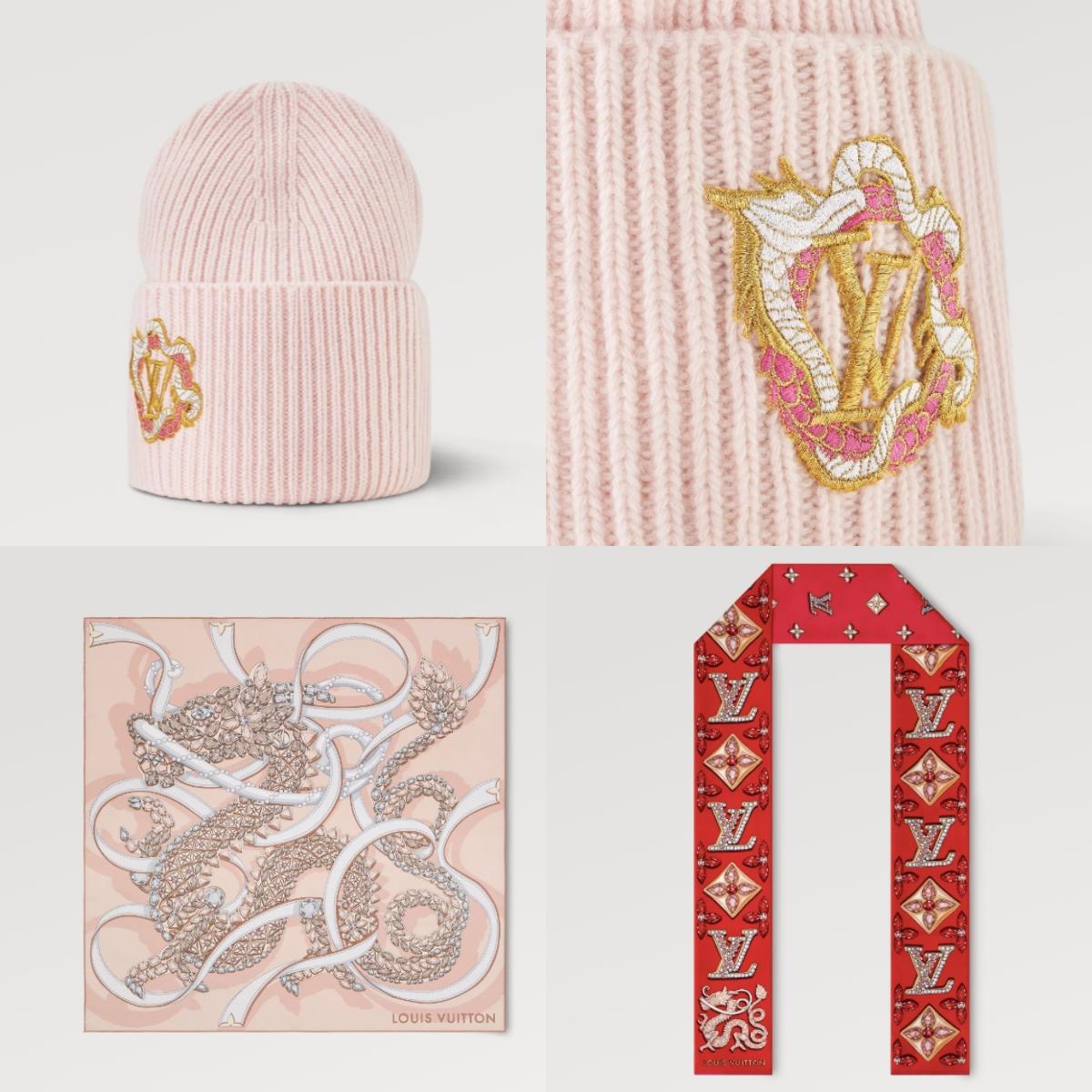 LOUIS VUITTON以一系列優雅的配件來慶祝龍年,在冷帽上刻劃出一條於閃爍金色LV Initials標誌四周盤旋的雄偉蟠龍,高貴又不失時尚格調。絲巾的圖案設計同樣也是細節滿滿,宛如鑲有珍貴寶石的雄偉騰龍搭配華麗精緻的LV Circle標誌及Monogram花卉圖案,是早春增添高級溫柔感的加分配件!