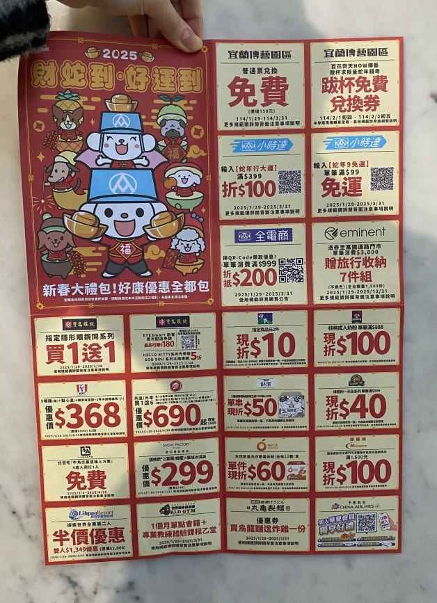 福利熊蛇年生肖偶袋:300元,內含福利熊夾鏈袋組(生肖偶袋獨家)、福利熊1,000片益智拼圖(5款隨機出貨)、蛇年紅包袋5入(2款隨機出貨)+新春大禮包(含宜蘭傳藝門票兌換券)、舒潔3層極厚韌抽取衛生紙100抽、蒲公英環保三層抽取式衛生紙便利包110抽、悅氏熟成無糖紅茶550ml、一匙靈極效洗衣霸7入或天地合補金盞花葉黃素凍2入(此2款隨機出貨)(抽獎序號:1組)