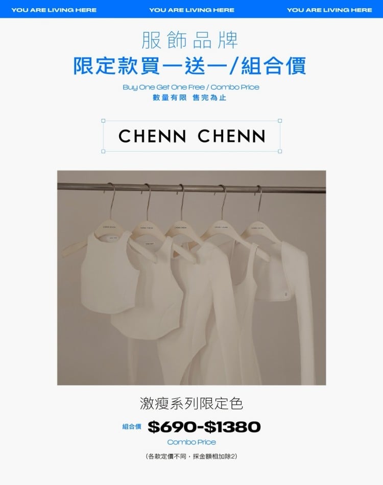 CHENN CHENN:致力於以「精」與「簡」的平衡搭配流行趨勢,融入於日常百搭、舒適的穿著,並持續將品牌簡約優雅的靈魂注入細緻巧思的設計,不費力穿出自信與自在!