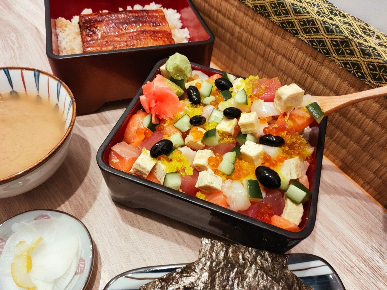 初鰻的「七彩寶石丼」採用特別的散壽司吃法,以多種海鮮與配料切製而成,每一塊都是入口的最佳大小,有鮭魚、鮪魚、旗魚、海鱺等魚類,還有小黃瓜、黑豆、蝦卵等等的配料增添口感,不管是配著飯一起吃、淋入醬油攪拌再吃,或是搭配海苔包夾入口,每一口對味蕾都是前所未有的衝擊(配海苔真的超讚)!