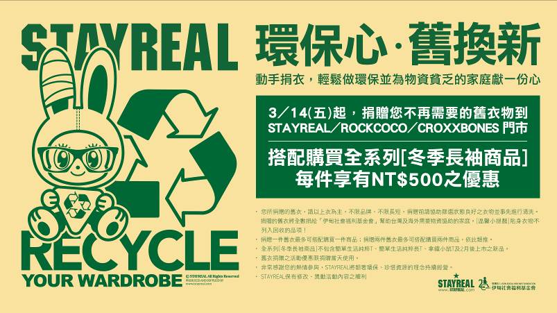 創意品牌STAYREAL向來推動環保議題不遺餘力,趁著植樹節之際,響應資源環保再利用的概念,首度大規模舉辦「環保心‧舊換新」的活動。STAYREAL成立至今,向來以不打折聞名,本次為了鼓勵民眾重視環保與響應回收,特別於3月14日起,祭出優惠的利多活動,呼籲消費者,凡捐出不需要的舊衣至STAYREAL、ROCKCOCO、CROXXBONES實體門市,購買冬季商品即可現省500元優惠折扣!希望消費者在為衣櫃換季的同時,能夠將用不到的東西,捐助出來幫助更多的人,此活動STAYREAL將整理回收後的舊衣捐贈至「伊甸基金會」,幫助台灣及海外更多需要物資協助的家庭,STAYREAL號召全員行動捐衣愛地球,改變世界從你我開始!