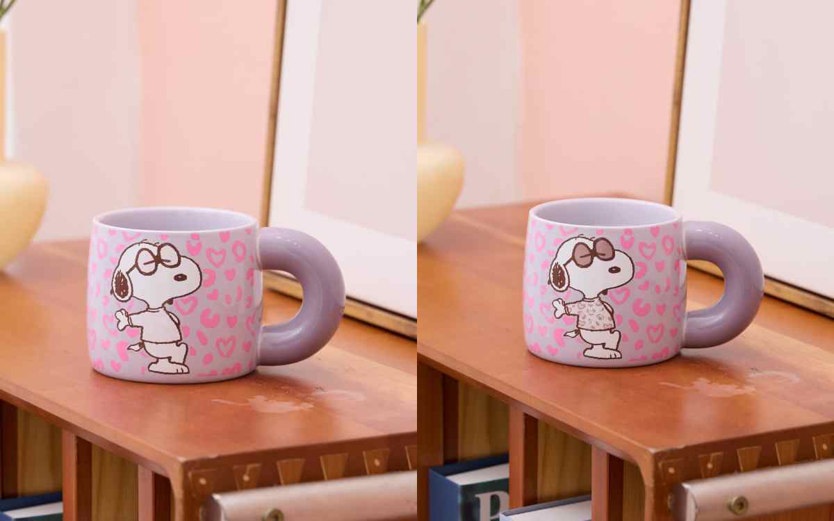 雙杯面的設計,一面寫上SNOOPY字樣,另一面則是SNOOPY戴上眼鏡帥氣擺拍,粉紫色豹紋杯身設計又自帶少女感。耐熱陶瓷材質,倒入熱水後,杯身的豹紋圖樣會悄悄的變化帶來小驚喜。加購價NT.299