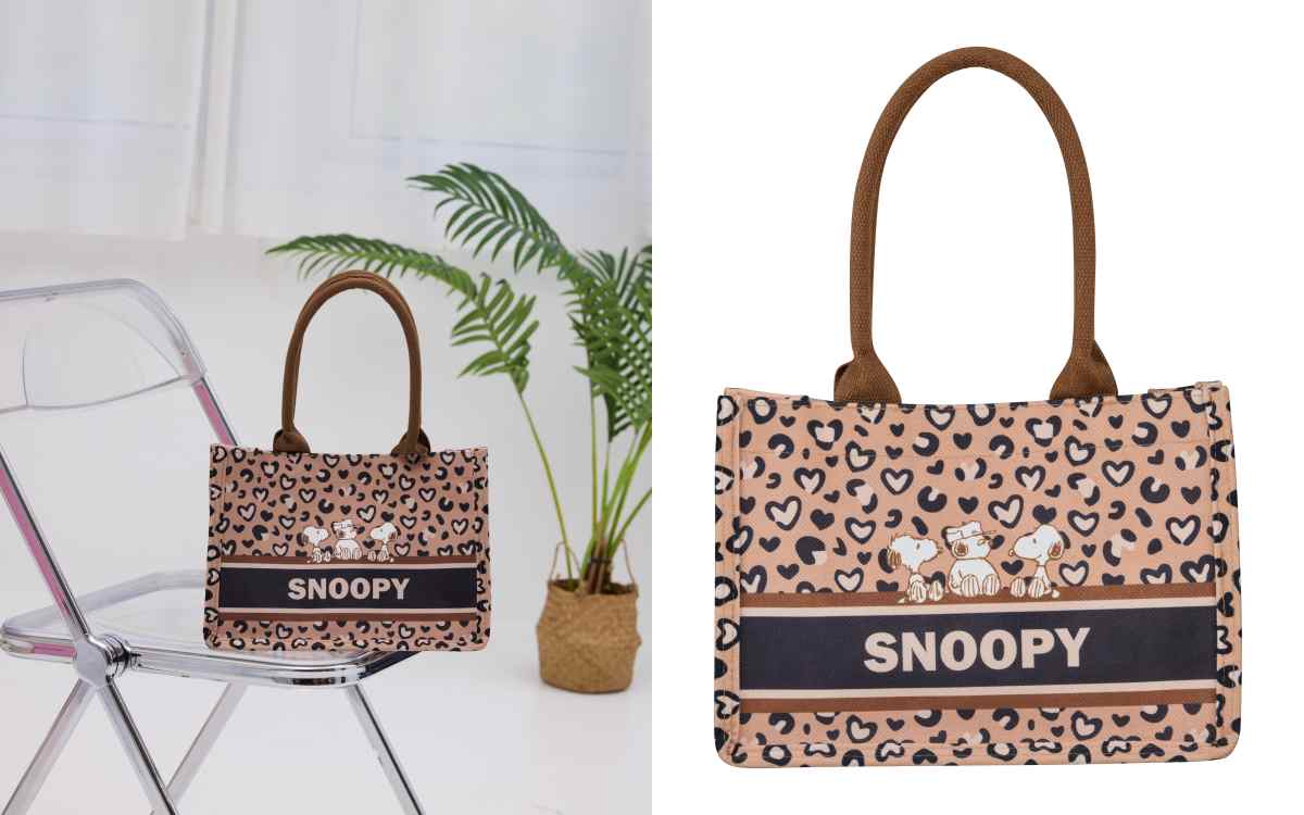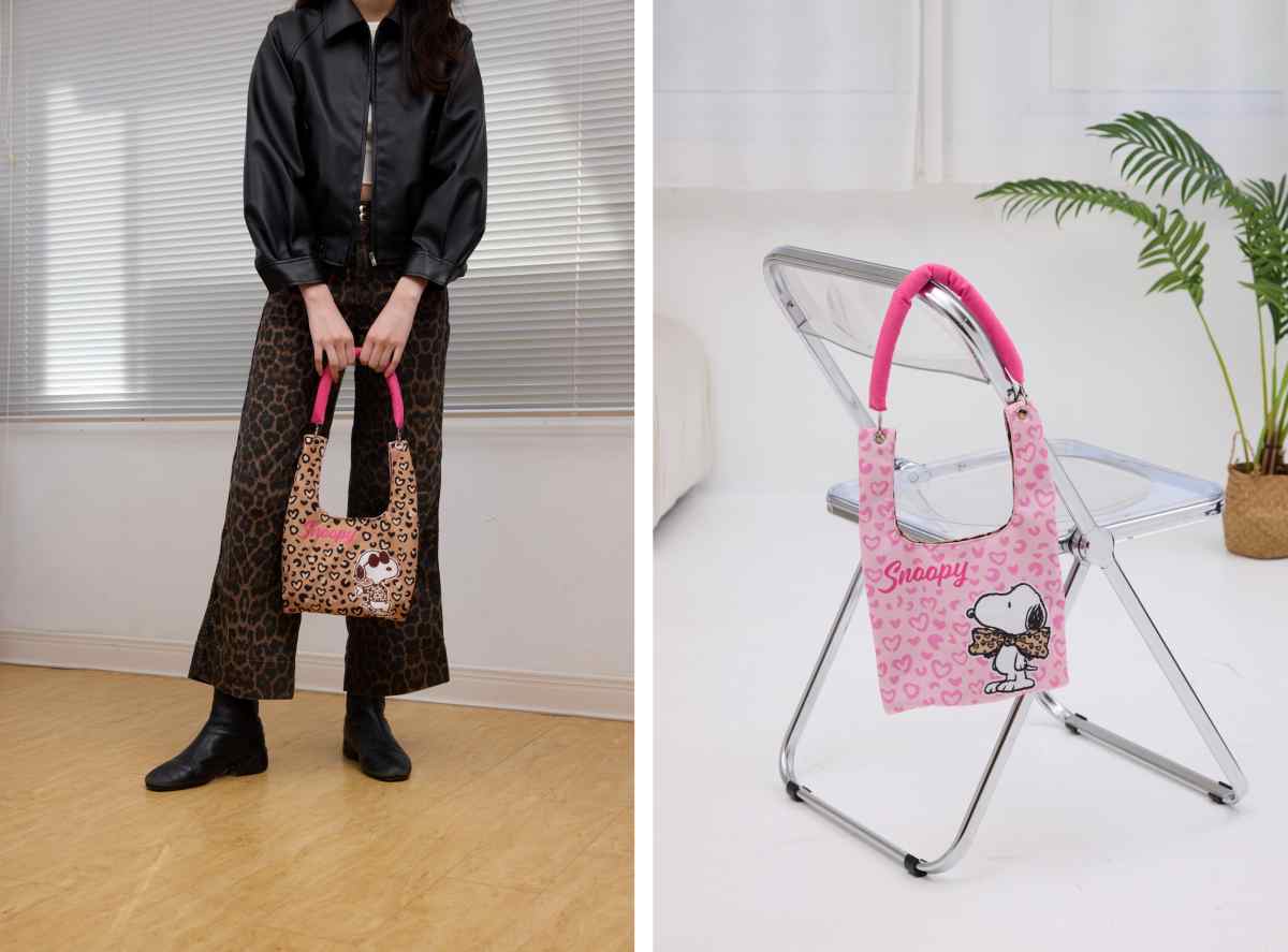 這咖提著出門超吸睛!咖啡色愛心豹紋,上面還有SNOOPY字樣點綴,提把貼心加粗設計,不只更耐用還舒適好握,內部則有扣環設計,內裝的物品較不容易掉出。加購價NT.399