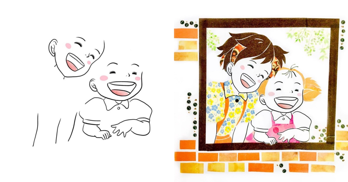 貳零除了有相當程度的繪畫能力,多色紙膠帶的運用更是展現了她的用心。吉卜力動畫《龍貓》中的主角姐妹月與梅的服裝與髮型其實不好塑形,不過只要依照描圖草稿上描的圖案,並適時以小型的筆刀割出頭髮的光澤,背景則是善加利用人物身上已經出現過的顏色來點綴,整幅作品就能既和諧又充滿巧思!