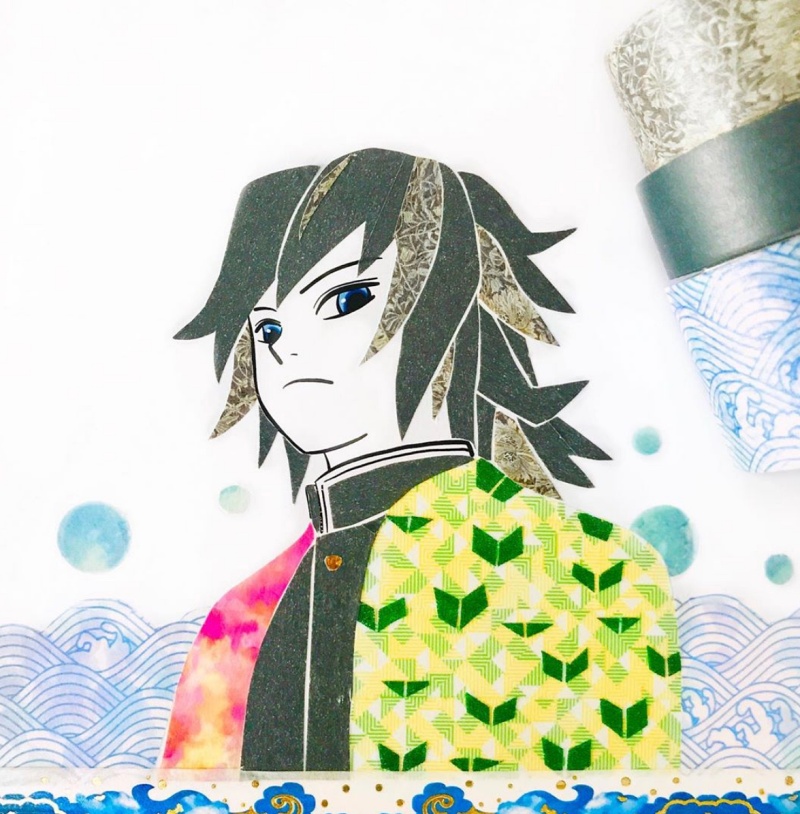 《鬼滅之刃》水柱富岡義勇的作品也相當用心,除了把半邊羽織用類似色系還原,背景還運用了水之呼吸的波浪來襯托,一眼就能看出他的專屬招式!