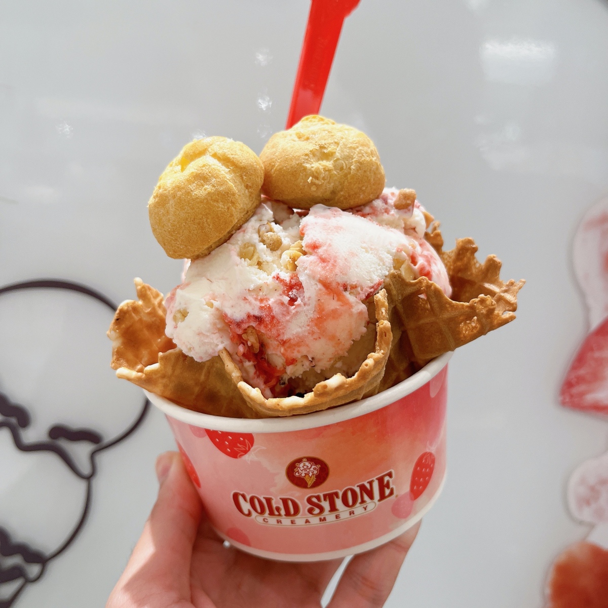 「優格美莓」基底選用乳香濃郁、口感綿密的草莓優格冰淇淋,再拌入草莓與水果脆麥片,最後放上內餡滿滿的奶油泡芙,風味清爽,微酸微甜的滋味就如同戀愛一樣,讓人想一吃再吃,停不下來。