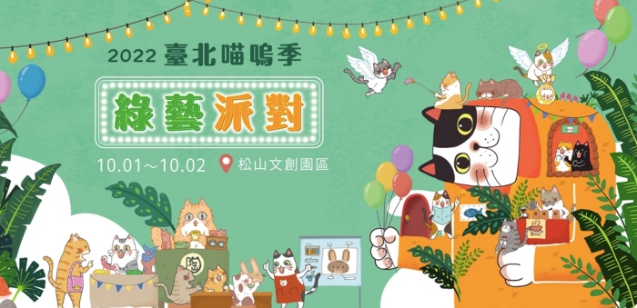 全國最大室內貓咪主題市集「臺北喵嗚季 - 綠藝派對」即將開跑!結合綠藝概念的展覽將於松山文創園區舉辦,匯集以貓咪為創作主題的文創手作職人,以及喵嗚市集每次舉辦必有的公益認養,將邀請臺北市流浪貓保護協會等動保公益團體,帶來近百隻浪貓,尋覓有緣的愛貓人。這是一場互動性、體驗式的貓咪主題節慶,期望能紓解因為大環境變化而備感壓力的身心,讓人和貓都快樂!(點我前往官網)