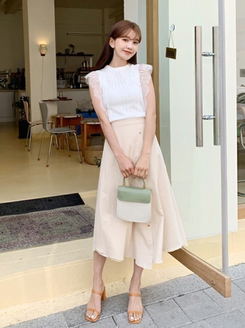 想要看起來既仙又有氣質的關鍵,就在蕾絲~這件背心的蕾絲裝飾能夠修飾手臂,搭配高腰白色長裙和手拿包、細帶拖鞋,穿這樣去約會很可以耶~