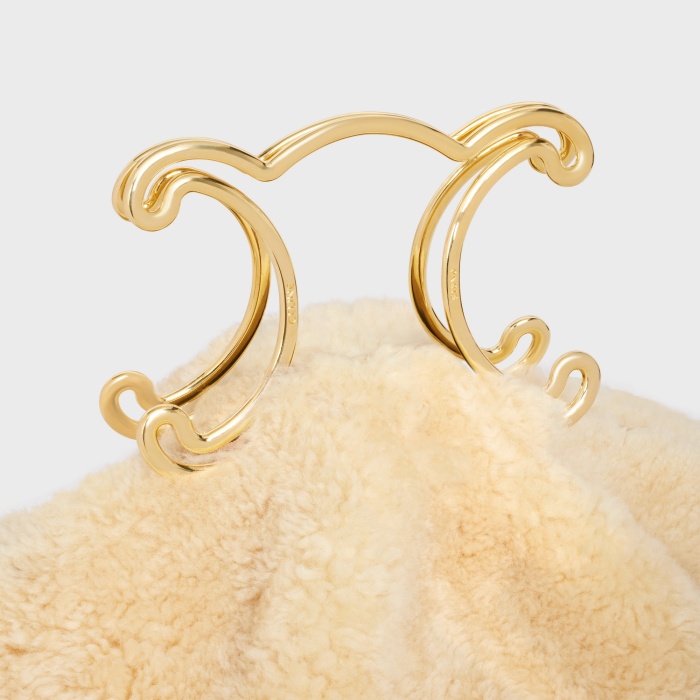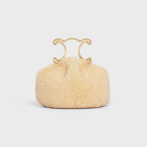 這次鏤空的凱旋門Logo還有做為包包提把的設計,這款提把設計早在CELINE 2022春夏系列中就能在一款三角形的「Triangle Triomphe Frame」老花手袋上看到,這次則是搭配上了超級可愛的米色羊毛小手提包上,金色的凱旋門輪廓搭配上米黃色的羊毛小手袋,可愛度破錶~~