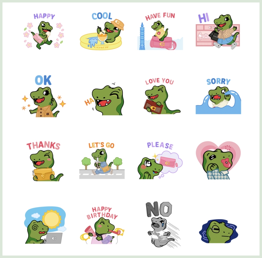 COACH 全新官方限定貼圖,以「Rexy&Tabby」演繹品牌人氣 Rexy 恐龍角色與經典 Tabby 手袋春季新款設計,讓你的日常生活對話充滿獨特時尚和個性!將 COACH 的官方帳號加入好友,即可擁有此貼圖。