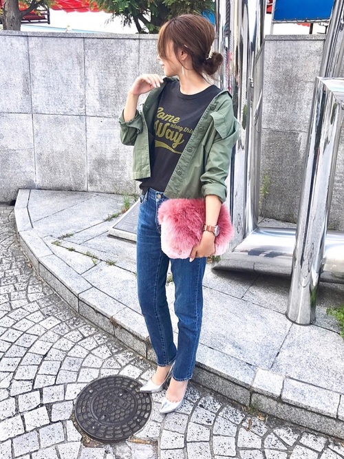 みやこ的穿搭跟ari很相似,不過卡通圖案的T恤與綠色包包搭配起來偏向童趣感,帶點復古味的造型十分可愛呢!