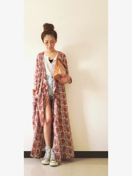 巧妙利用長版外套與牛仔短褲的長短差讓腿部比例看起來更修長~以橘色長版外套為重點,身上的襯衫與牛仔褲就盡量選擇淡色系效果會更好喔!
