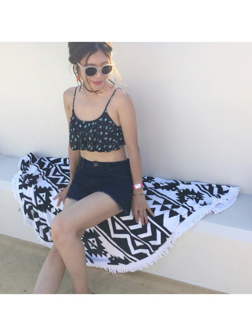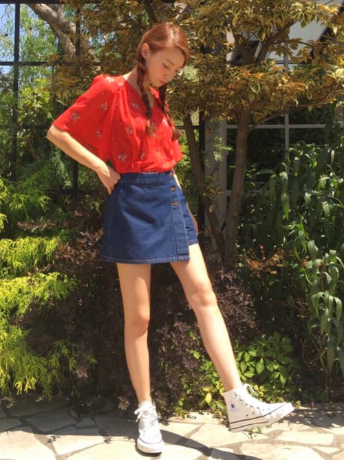 不對稱剪裁的牛仔片裙給人俏皮又有活力的感覺~鮮豔的印花上衣給人強烈的印象,整體來說不會過於複雜卻非常吸睛!