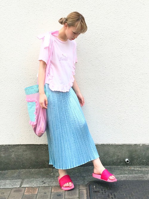 搭上雙丸子頭的萌度,讓這些粉嫩得出水的顏色變得一點都不突兀!不只是顏色引人注目,連服裝材質上的選擇也很有趣呢~