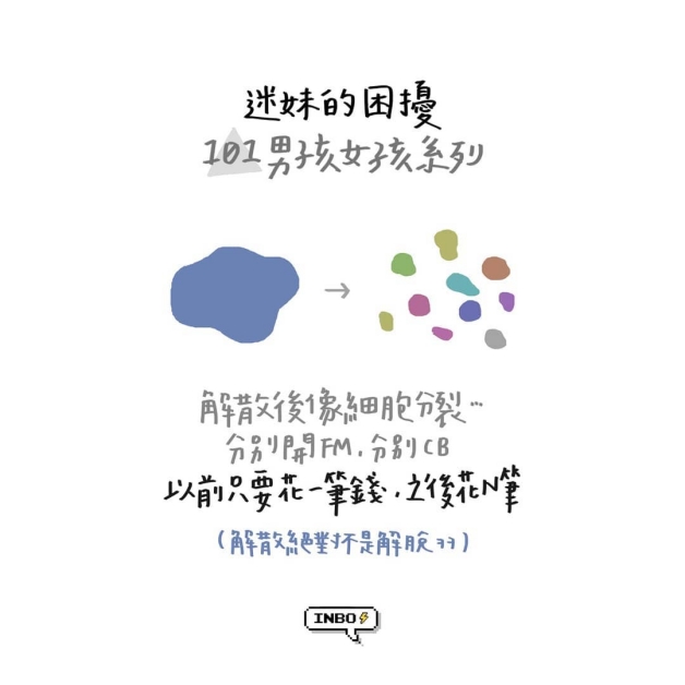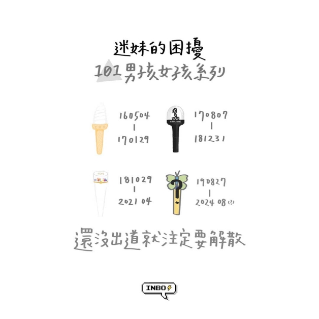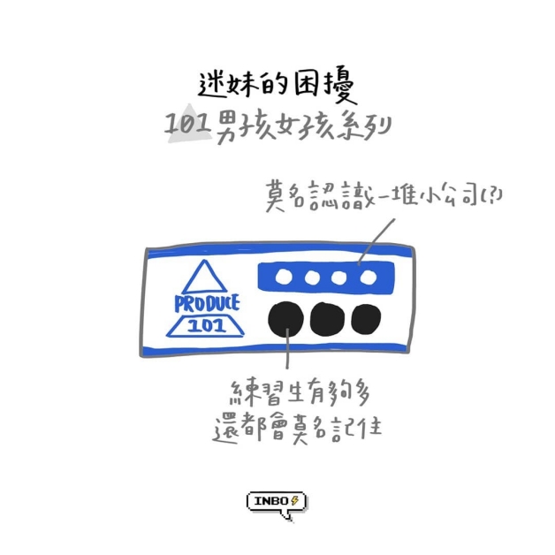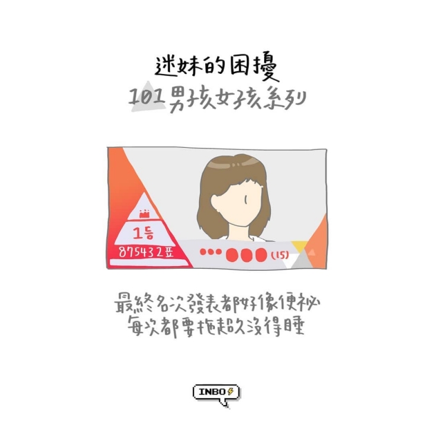 繼上次介紹過「迷妹超有共感的通病與困擾們」之後(想看請點我),我們INBO迷妹日常又釋出新的一系列插畫,主題為「迷妹的困擾:101男孩女孩系列」,從2016年第一季的《PRODUCE 101》到2019年第四季的《PRODUCE X 101》,每次看完都說「下次不追選秀了」、「以後不看了」,結果202、303、404還是照樣給他追下去,對~我們就是一群嘴巴說不要但身體倒是挺誠實的生物!