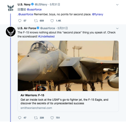美國海軍再度幽默引用《捍衛戰士》的台詞回嗆空軍:「記好了各位,第二名什麼都沒有」,還有網友期待陸軍也加入戰局,有時候真的覺得美國人挺幽默的!