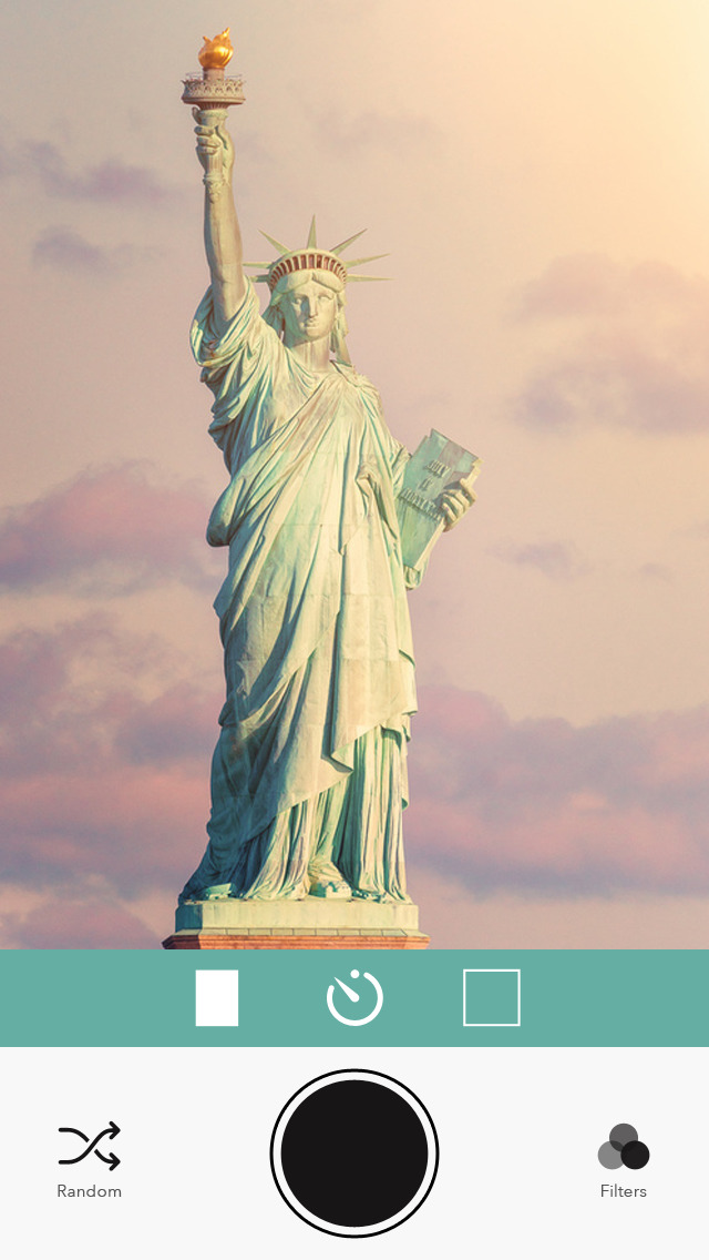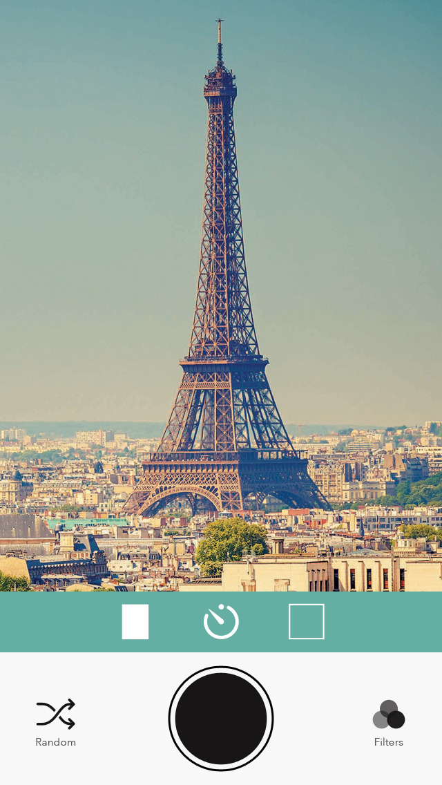 內建黑白、懷舊、馬賽克等五種濾鏡主題,而每種主題內又有多種特效可以選擇,並可依個人喜好設定倒數計時拍攝的秒數。如果不曉得要選擇哪種濾鏡,可以按左下角的「Random」,體驗隨機濾鏡的驚喜。