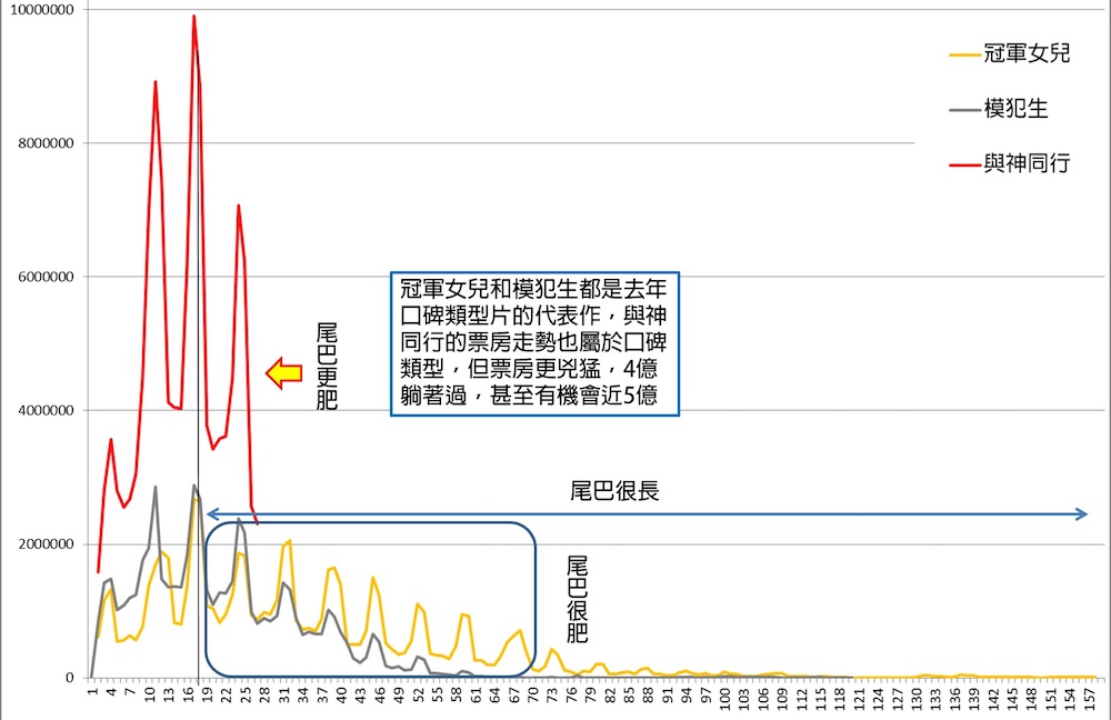 那【長尾效應】又是如何呢?它的出現顛覆了過去的80/20法則,告訴我們資源不一定是由那少數的20%獲得,後面積少成多的加總也能成為一筆可觀的數字,套用在票房也是一樣,當然並不是每一部電影都有長尾效應,基本上僅限具有「口碑」的電影,想知道什麼是「口碑效應」的話,之前的文章就有寫到:https://goo.gl/Nh4J1K