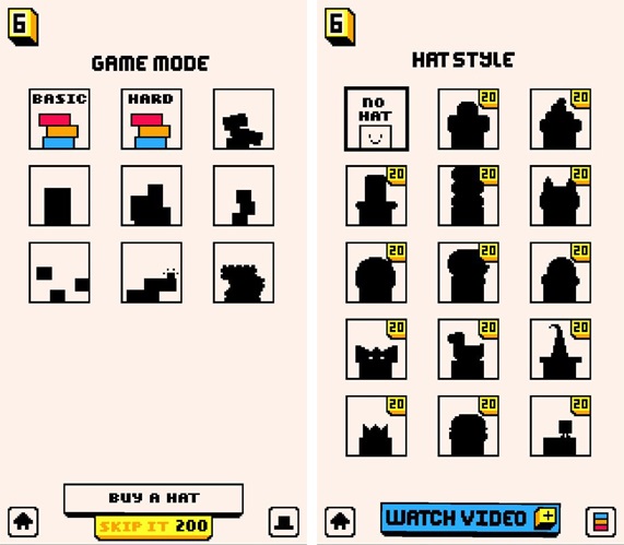當玩家碰觸到黃色小方塊時,就能累積點數買帽子、解鎖遊戲模式,而且還可以越來越歪斜的積木排好!所以當你看到下方積木越來越歪時,就加快速度吧~