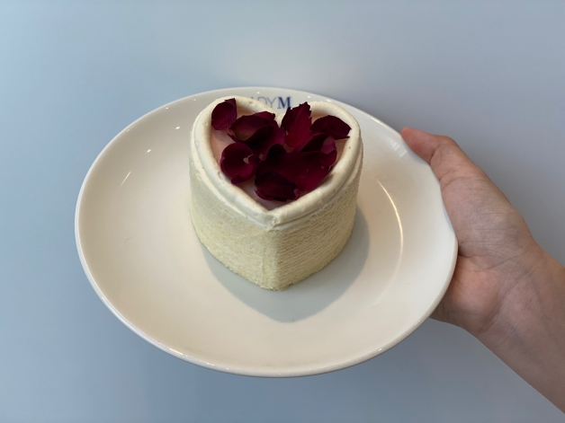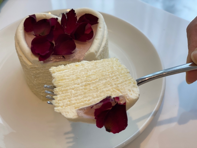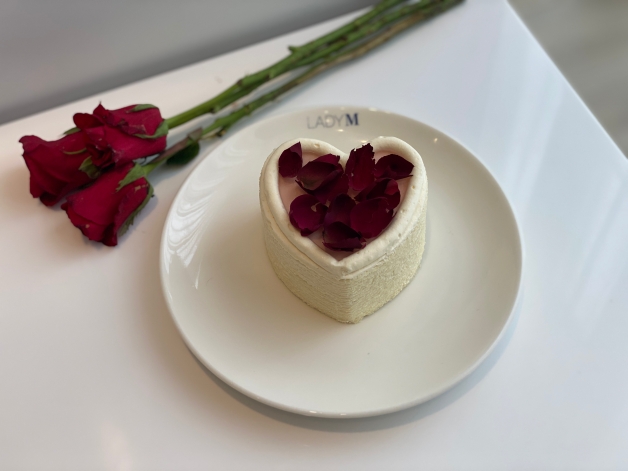 Lady M的第一款花香主題「玫瑰千層蛋糕」,主廚特別因應七夕使用可食用的紅玫瑰花瓣進行點綴,最上層則是呈現粉嫩的鏡面,薄透蛋皮層層堆疊,吃起來除了帶有玫瑰香氣之外,卡士達鮮奶油更是在口中綻放,幸福感十足!