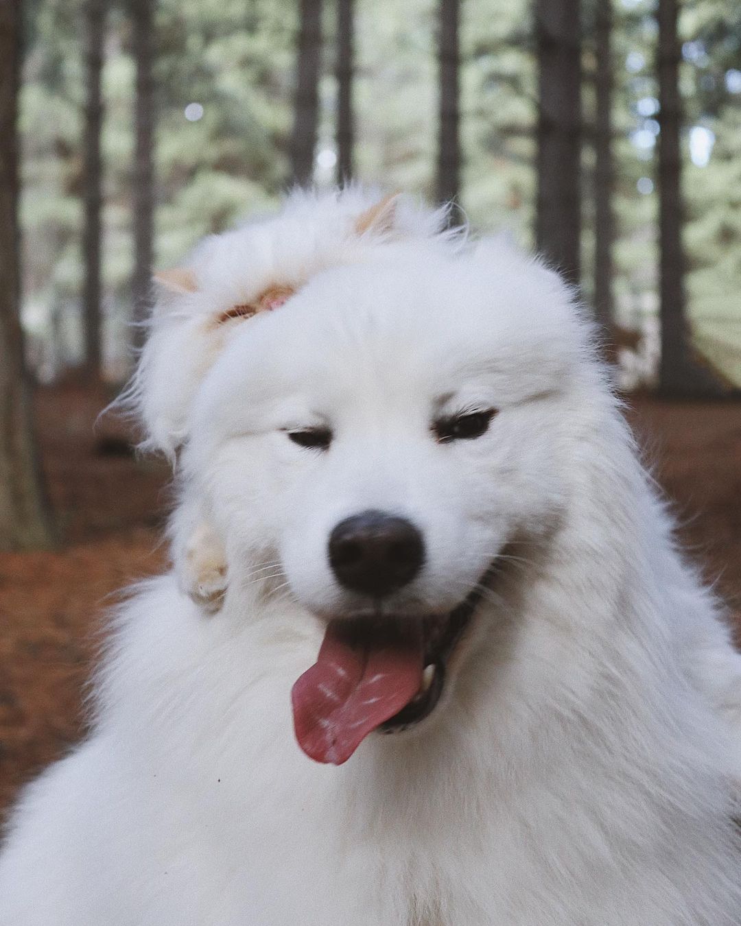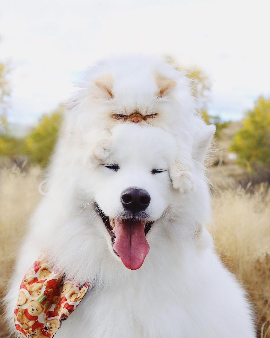 根據主人的說法,家中本來只有養ㄧ隻薩摩耶「Casper,後來同樣愛貓咪的鏟屎官,才決定再領養一隻喵星人Romeo」。兩隻毛小孩雖然擁有同樣白色柔軟的毛,但個性卻是南轅北轍⋯⋯Casper是隻總是笑口常開的開心狗,Romeo則是脾氣暴躁、笑比哭還難看的臭臉貓咪,住在一起牠們的生活會是什麼樣子呢?這對「貓狗配」經常被網友們戲稱:「光看外型就覺得牠們不合!」(妞妞們覺得呢?)