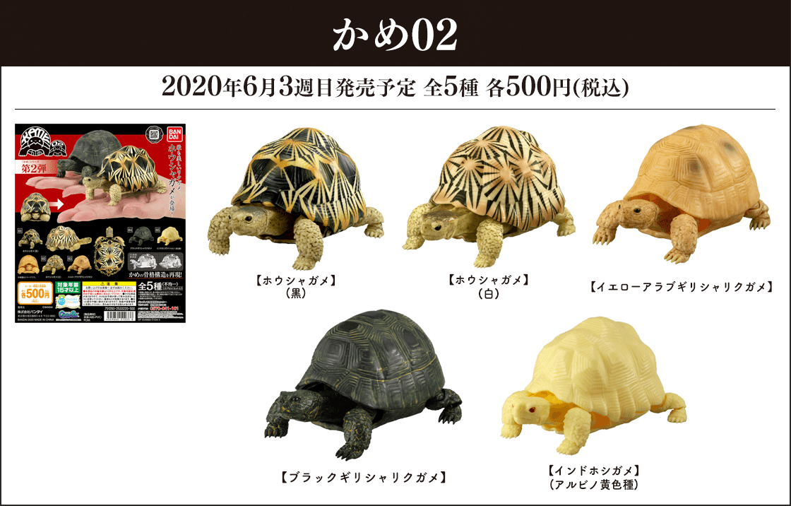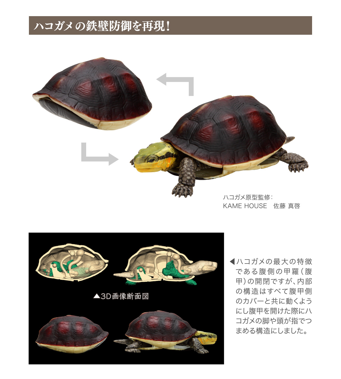 第四彈的「烏龜04」扭蛋,推出跟以往皆不同外觀的食蛇龜(セマルハコガメ)、馬來閉殼龜(マレーハコガメ)、白化閉殼龜(リューシスティック)&鱷龜(ワニガメ),不僅有專家擔任原型監修,還有動物造型師監督,還原程度可說是100%啊!(逼真到可以幫它買新家)
