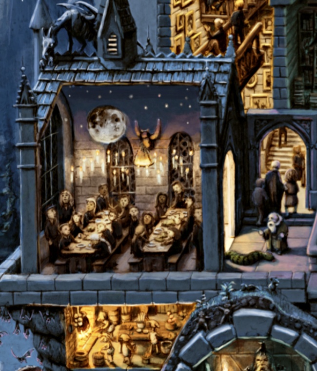 畫面中最熱鬧的一角,就是大家熟悉的「學生餐廳」,學生們排排坐享用憑空生出的餐點,上方漂浮的蠟燭以及夜空魔法也如實繪出,下方廚房正在忙碌準備的家庭小精靈也精細呈現。