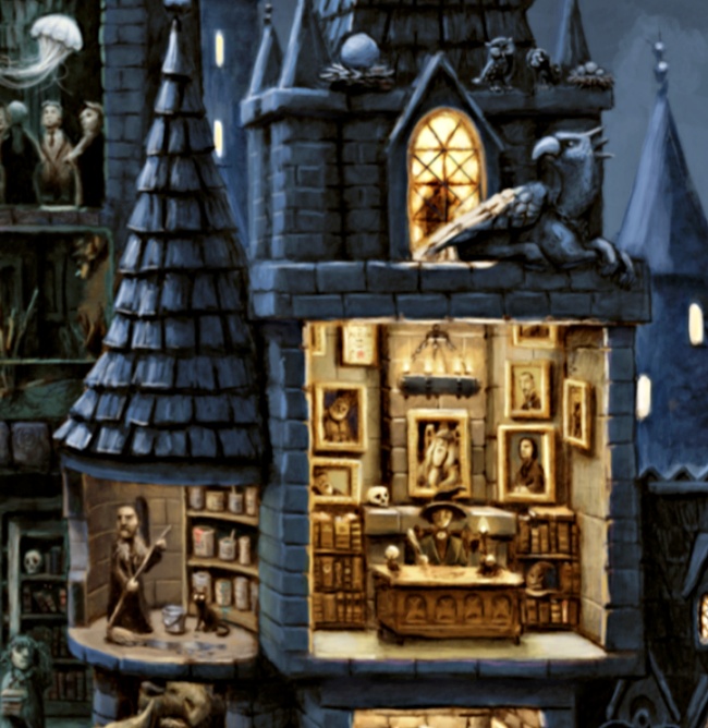 畫面右下方被光禿禿的石牆圍繞的地下「史萊哲林學院入口以及交誼廳」也神還原,幾名史萊哲林學生正圍著爐火不知道在做什麼?而正下方就是位於地牢的魔藥學教室,看起來依舊很冷~