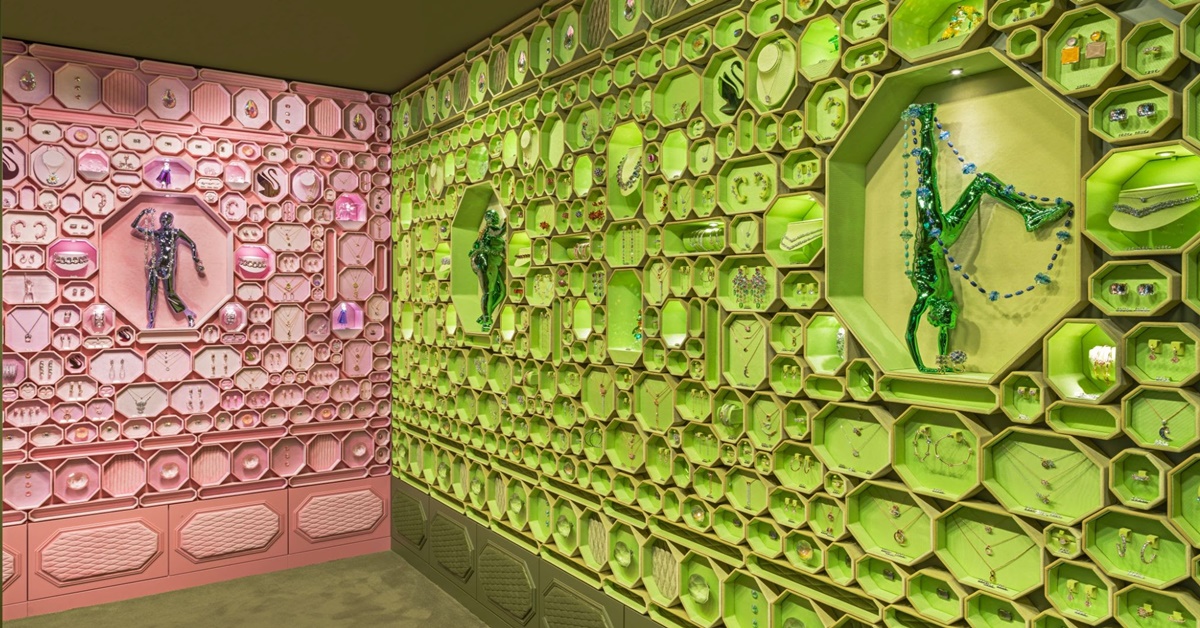儘管Instant Wonder只是品牌重新出發的其中一個項目,迷人的全新包裝盒在展現 Instant Wonder專門店栩栩如生的活力中扮演了重要的角色。每家專門店將輪流以白色、粉紅色、綠色、藍色和黃色等五種顏色來進行展示,這些顏色的靈感來自光線透過水晶折射而出的繽紛色彩。牆面則利用八角形包裝盒裝飾,從地面排列到天花板,單一色系配上重複的圖案,引人遐思。此外,金屬雕塑取代了傳統的首飾陳列,可展示更多產品陳列的呈現方式,使得每天都有品牌展現自我的機會。每個以生活為名或取材自生活的角色,皆是使用創新 3D 科技打造其姿態,呈現愉悅致趣的時刻。Swarovski的目標是從不同角度帶領人們進入它的奇幻世界,讓眾人留下難忘且驚豔的深刻印象。