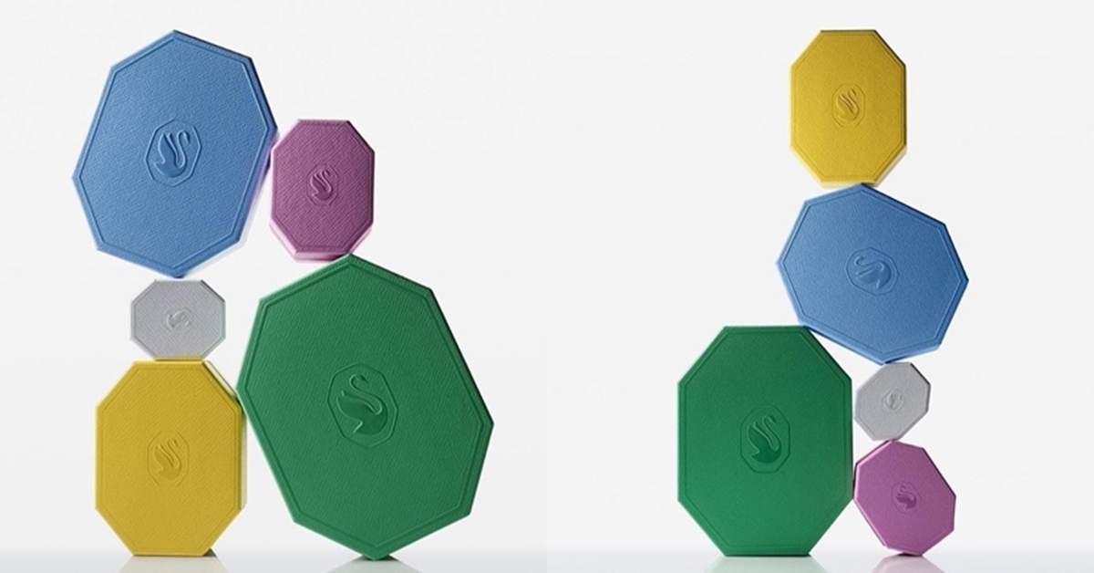 結合科學與夢幻的全新Swarovski品牌形象,在色彩、造型搭配和體驗上都進行全面重新定位,全新包裝盒蛻變成五彩繽紛的八角形;以八角形切割Swarovski水晶為靈感,不同尺寸的包裝盒分別以白色、粉紅色、黃色、淺藍色和綠色等五種顏色呈現,五彩顏色來自於光線透過水晶所折射出的色彩,八角形標誌輪廓搭配糖果般的繽紛色彩既生動又令人著迷。
