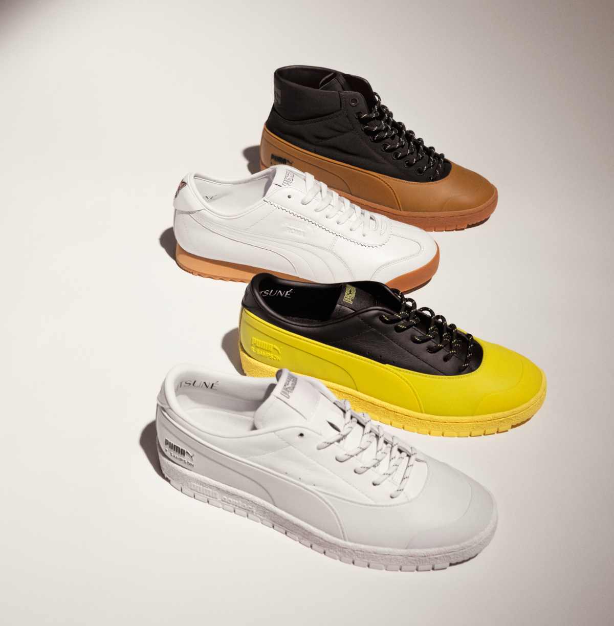 這次一共推出四款鞋,其中Ralph Sampson 70經典鞋款推出了高筒及低筒兩個選擇,黑色的鞋面搭配上對比搶眼的焦糖與亮黃色,其中Puma Roma Kitsuné鞋款更是這次聯名中的可愛必搶單品,白色的皮革鞋面搭配鞋身上的縫線及焦糖橡膠大底,穿上就是復古運動造型,重點是鞋後根超可愛的小狐狸刺繡圖案,更是這聯名鞋的吸睛重點!