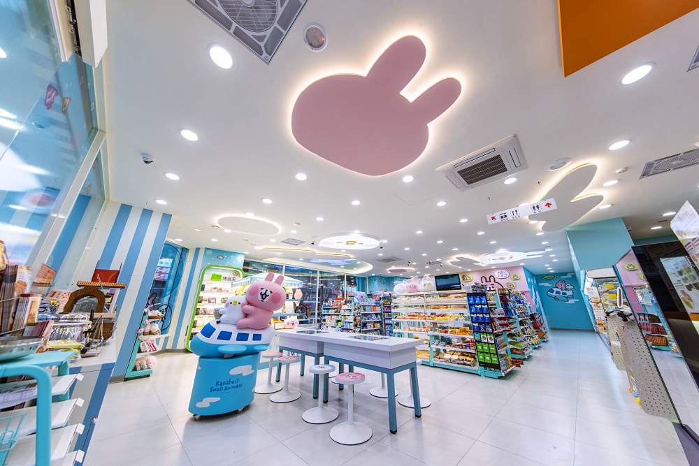 7-11×卡娜赫拉的小動物聯名店以藍色為主色,傳達藍天、海水的意念,門口天花板放上大型燈箱,玻璃窗則有好友們與海底生物現身賣萌,入店還可看到坐在飛機上的粉紅兔兔&P助迎接粉絲到來!