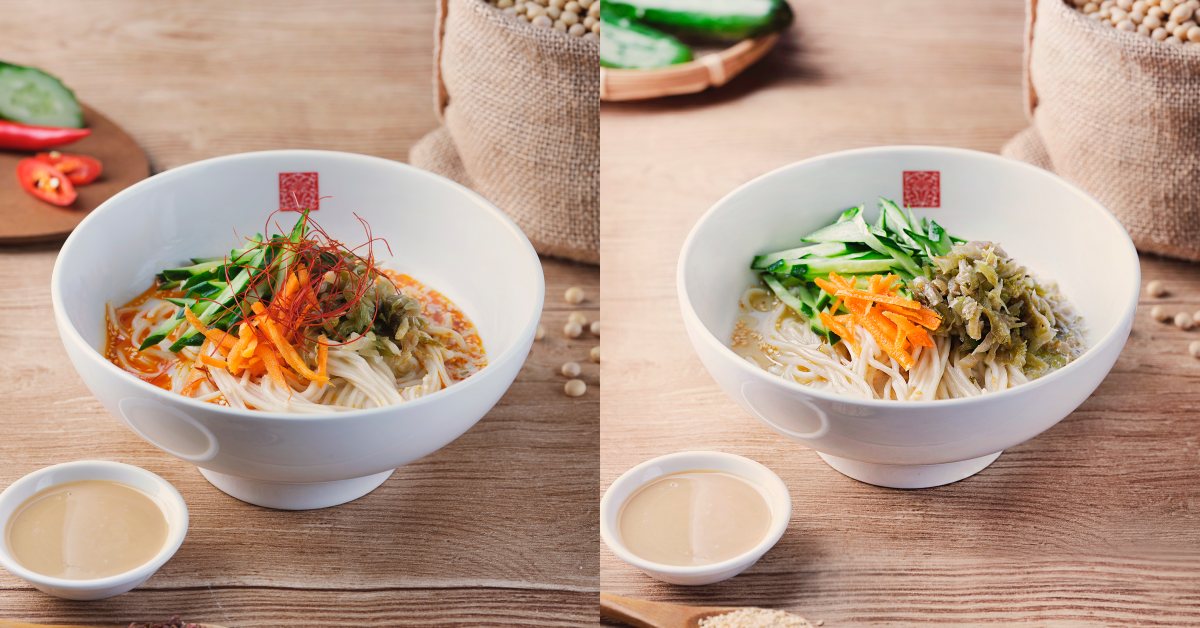 此次推出的兩款麵食特別地以豆漿為醬汁,「胡麻豆漿擔擔麵」使用細麵搭配黃瓜絲、蘿蔔絲、榨菜末,搭配胡麻淋醬,芝麻香氣濃厚、滋味清爽;「椒麻豆漿擔擔麵」,以濃醇豆乳搭配特製辣油,麻而香辣的滋味吮指難忘,嗜辣妞妞必嚐!