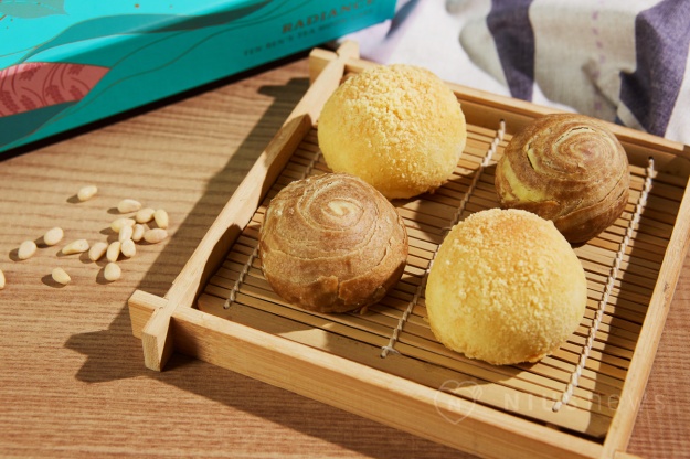 盒內共有「晶莎酥」與「紅茶芋泥松子酥」兩種茶月餅口味。兩款茶月餅皆以酥皮餅皮呈現,其中「晶莎酥」是由鹹蛋黃與白鳳豆揉和成微鹹內餡,酥皮外再灑上濃郁起司粉,香香濃濃好滋味瞬間充斥整個味蕾!