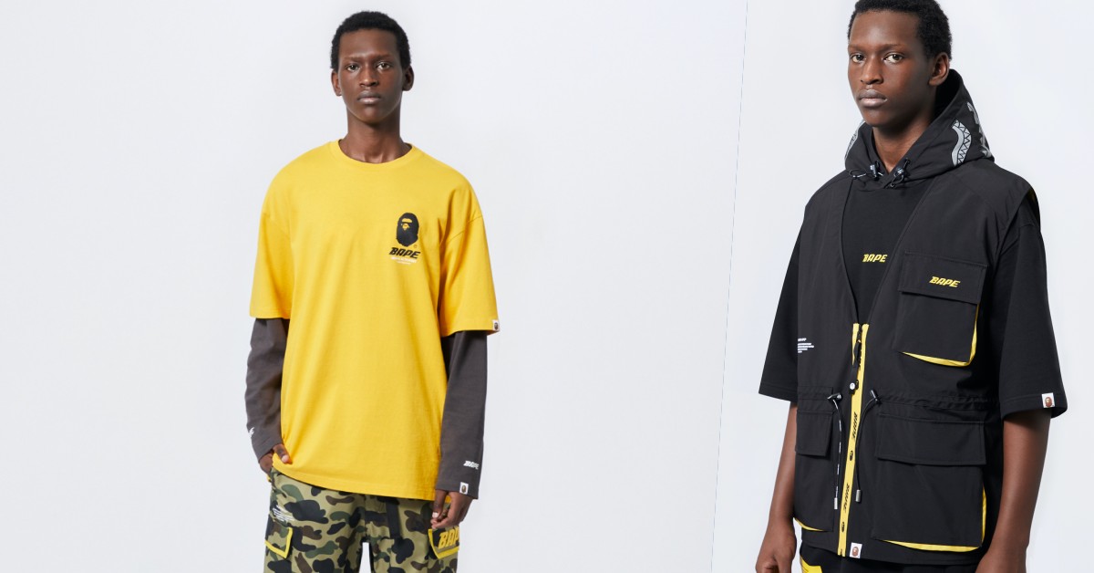 全新「(B)APE IN TRANSIT」系列以黑、白、灰和經典 1ST CAMO 為基底,點綴具有警示象徵意味的芥末黃色調,製造強烈視覺衝擊力。「BAPE」品牌字母以搶眼黃色跳躍於單品之上,「(B)APE IN TRANSIT」主題標語貫穿其中,迸發重視效率的都市速度感。系列釋出涵蓋鯊魚連帽外套、連帽衛衣、機能背心、長/短袖 TEE、運動褲等 HARDCORE 工裝單品,助你塑造具有豐富層次感的工業風造型。