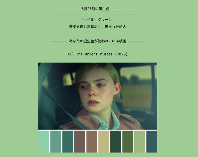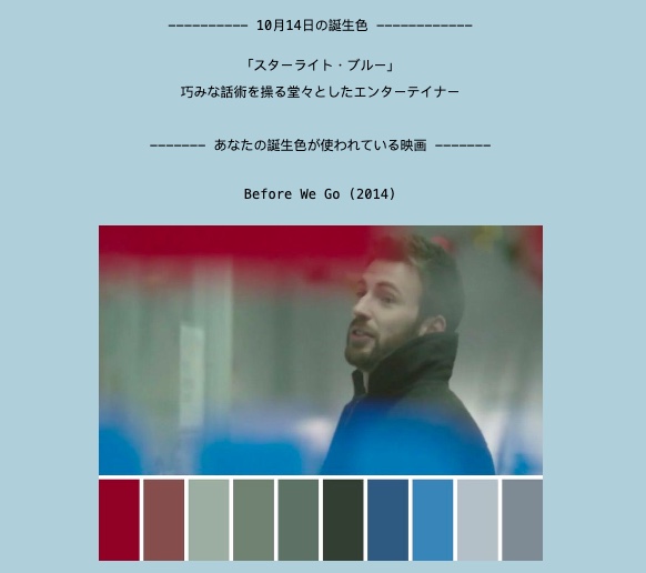 點進生日日期後,整個網頁背景會呈現你的生日專屬誕生色,寫上你的誕生色名和一句性格解析,下方就是有使用到你誕生色的電影,並且還會把其他有使用到的色彩一起放在電影劇照下,很適合色彩搭配的時候當靈感使用!
