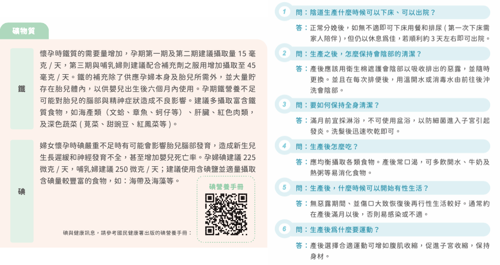 媽媽手冊是孕婦第一本拿到的衛教手冊,但有些資訊卻不實用,或是想知道的根本沒寫!在吃出健康部分寫了很多營養素,很貼心沒有錯,但裡面寫精準的毫克數對一般人來說根本沒有用(左),誰會去量?不如給點實際的例子(用茶匙當單位都比毫克數好吧)關於孕婦瑜伽、溫柔生產、會陰按摩等等行之有年的相關知識都沒有,關於產後護理的篇幅甚至只有一頁!(右)產後掉牙、掉髮、腰痠背痛也沒有寫(最後一句還不忘提醒保持身材~傻眼!),不僅刻板印象帶給產婦壓力,好像把媽媽當作生產工具,懷孕期要求一堆、孕後需求卻不被關心與在乎......