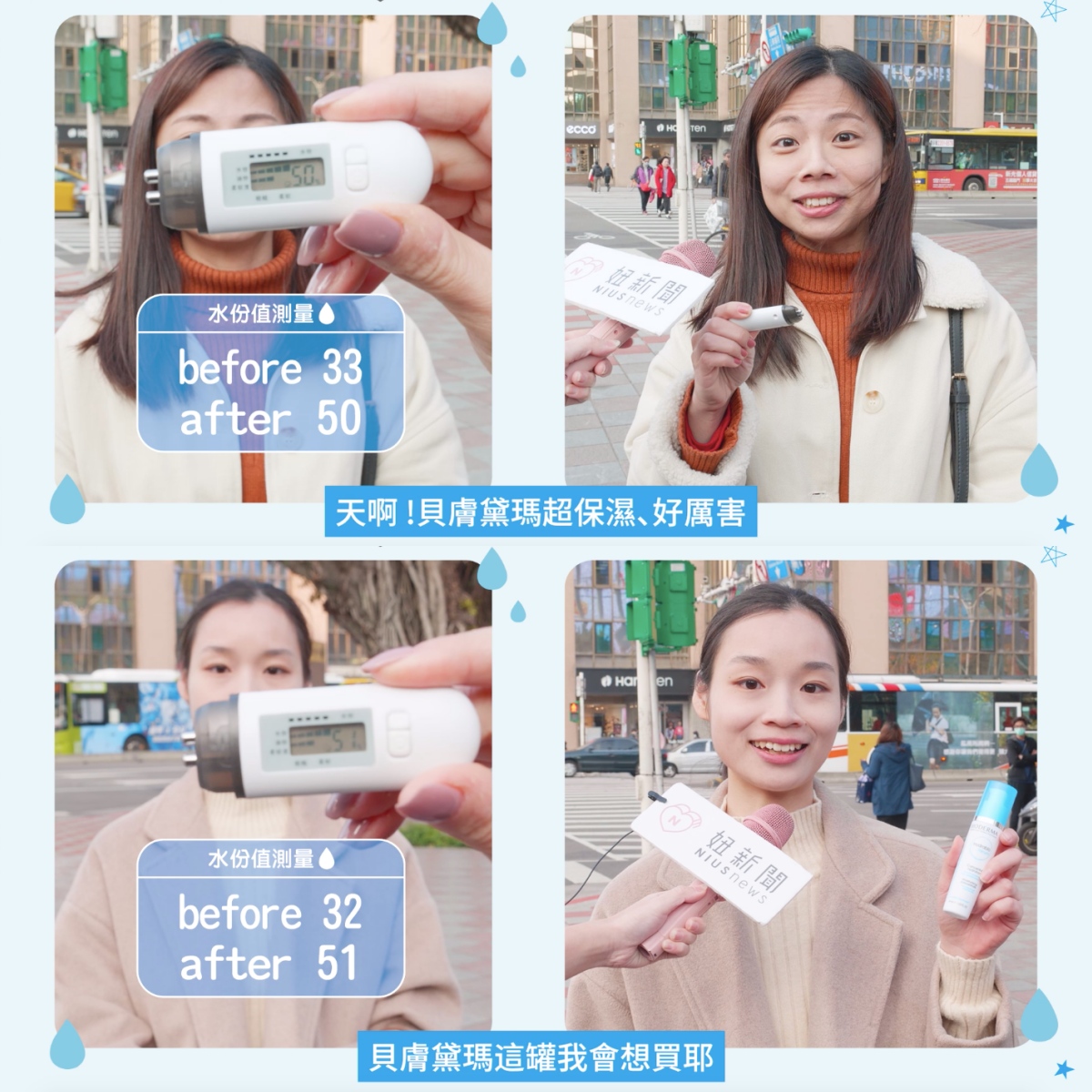 妞新聞街頭大調查也讓受訪者實際體驗保濕水潤精華的威力,輕輕一擦,清爽好吸收,但是保濕效果卻相當驚人,水分值測量幾乎都提升17~19%,讓受訪者驚為天人,直呼超想買!貝膚黛瑪保濕水潤精華不僅是皮膚專科醫師推薦的完整保濕勝品,使用者滿意度更高達95%