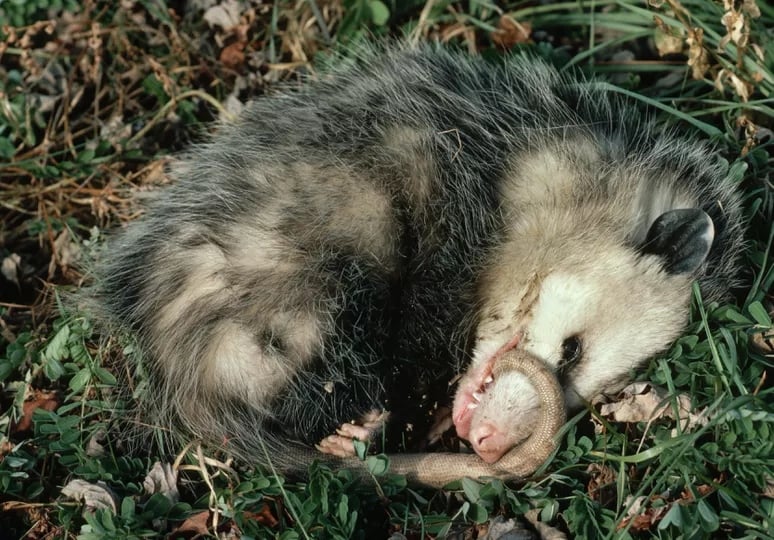 負鼠最有名的技能就是「裝死」,當牠們受到威脅的時候,會先發出嘶嘶聲並露出牙齒,如果這樣的方式嚇阻不了敵人,牠就會原地躺下、張開嘴巴、翻白眼,接著會從體內排出惡臭的氣體並把心率和呼吸速度調慢,這樣就能讓捕食者以為牠是坨腐爛的肉,而且牠們的裝死時間短至幾分鐘,最長可以到6小時!