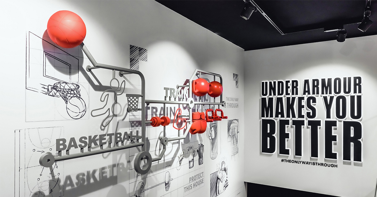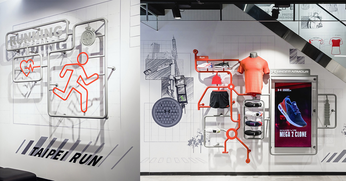 UNDER ARMOUR座落於臺北運動聖地─大安森林公園旁,為提供跑者最專業的跑步裝備,特別以跑步主題規劃整個一樓層面,不僅提供防潑水、抗風、緩震等跑者最在意的裝備科技,更特別將臺北城市的特色巧妙轉化為陳設與牆面,除了指標性建築物101、人孔蓋、紅綠燈、斑馬線等街景元素,更在入口處打造跑步主題牆,提供運動愛好者在購物時的新打卡牆面。