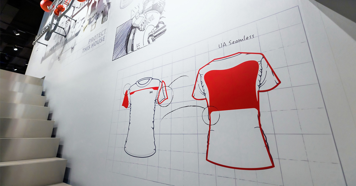 UNDER ARMOUR多年來致力於深入研究各領域運動者訓練型態、發展出多款運動機能商品,為了幫助運動愛好者更加了解專業裝備的科技研發歷程,UNDER ARMOUE城市概念店特別於牆面展示大量手繪草稿底圖以及商品解構後的配置,闡述品牌在研發機能與科技裝備時,會經過不段的修改測試、並考量許多科學因素和運動員實測分析數值,最終推出符合運動員需求的創新科技裝備。