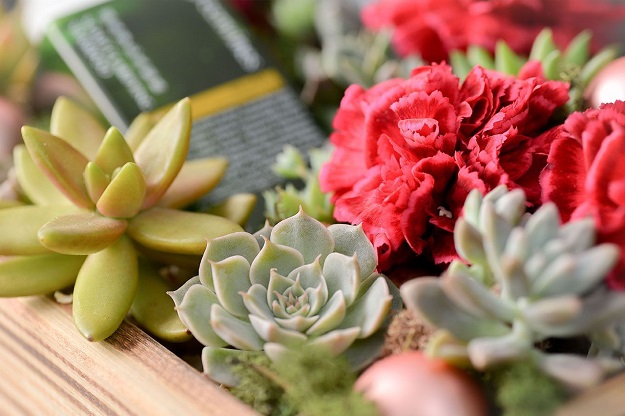 新鮮康乃馨花卉與豐富多肉植物組合成的新型花肉禮盒,待花卉凋謝後,還可將多肉植物直接種植進由南方松打造木盒中,母親節就是要送媽媽一份賞心悅目的實用好禮。