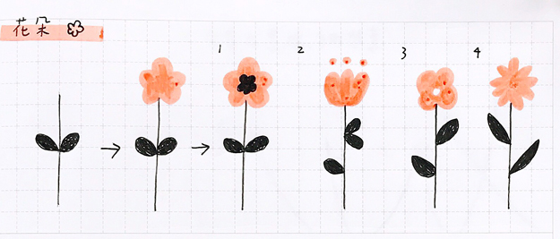 首先先畫出花朵的莖和葉子,葉子塗黑可以讓形狀更明顯、簡約。花朵畫法則是先畫出輪廓,再將中間塗色。