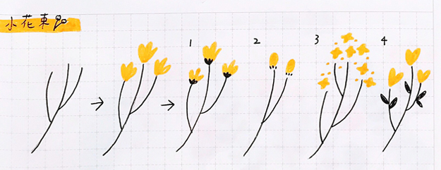小花束彎曲生長的莖是重點,中間那條主線最長,其他線短一點並畫出朝向主線的曲線,這樣就成功一半了!畫上花朵後可以加上黑色葉子點綴。